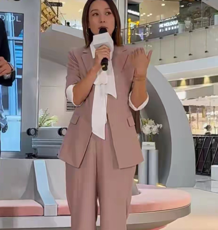 穿着粉色的套装,配白色衬衫,还带着蝴蝶结,头发也比之前略微长了一些,还穿着平底运动鞋,这一身的打扮很年轻,也很随性,身材更是保持的纤瘦轻盈,像20岁的少女一般
